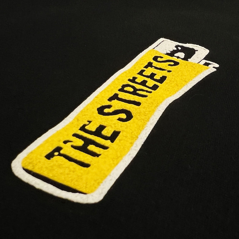 Relaxed fit, 80% cotton black pullover hoodie with yellow The Streets Lighter logo embroidered front print and Original Pirate Material back puff print.